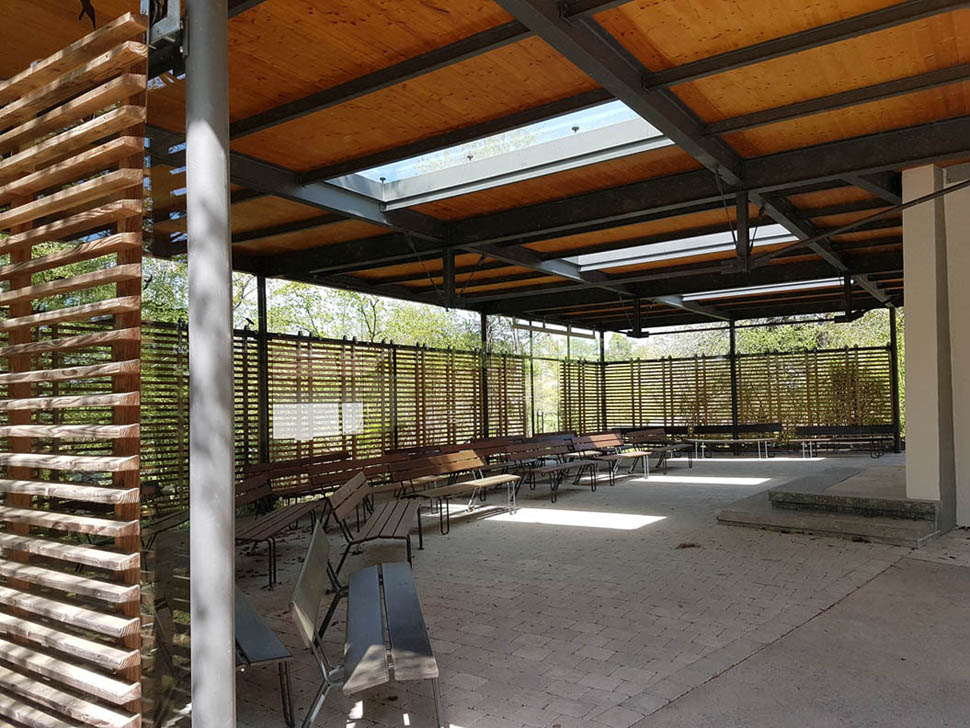 Neubau einer Überdachung als Stahl-/Glas-/Holz-Konstruktion in 2 Bauabschnitten neben dem alten Aussegnungsgebäude auf dem Unterjesinger Friedhof